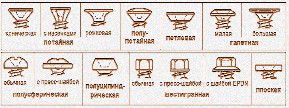 Головки делятся на две большие группы: потайные (countersunk), которые утапливаются в материал, и непотайные (non-countersunk), которые остаются на поверхности.